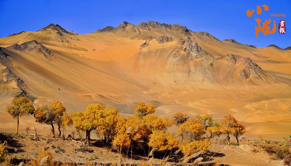 連綿起伏的沙丘如金色浪潮,環抱著一汪碧水,藍天白云倒映其中。金黃的胡楊在秋風中輕輕搖曳,宛如一群身著華麗服飾的衛士,默默守護著這片沙漠中的綠洲。