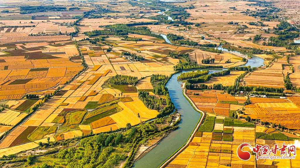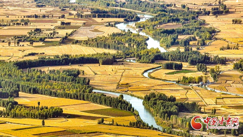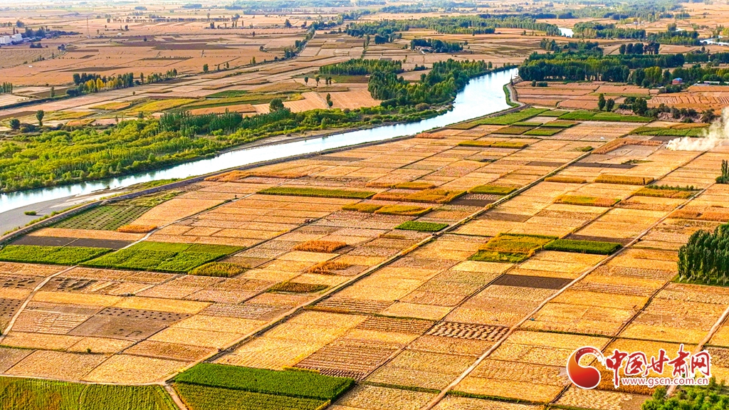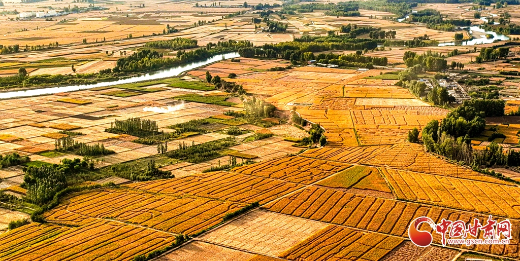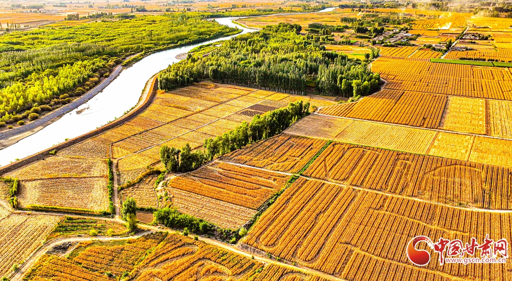 9月26日傍晚,夕陽映照下的黑河張掖臨澤縣鴨暖鎮段,蜿蜒流淌的河水與兩岸鋪滿金色的大地交相輝映,盡顯盎然生機,共同勾勒出一幅金秋豐收的壯美畫卷。